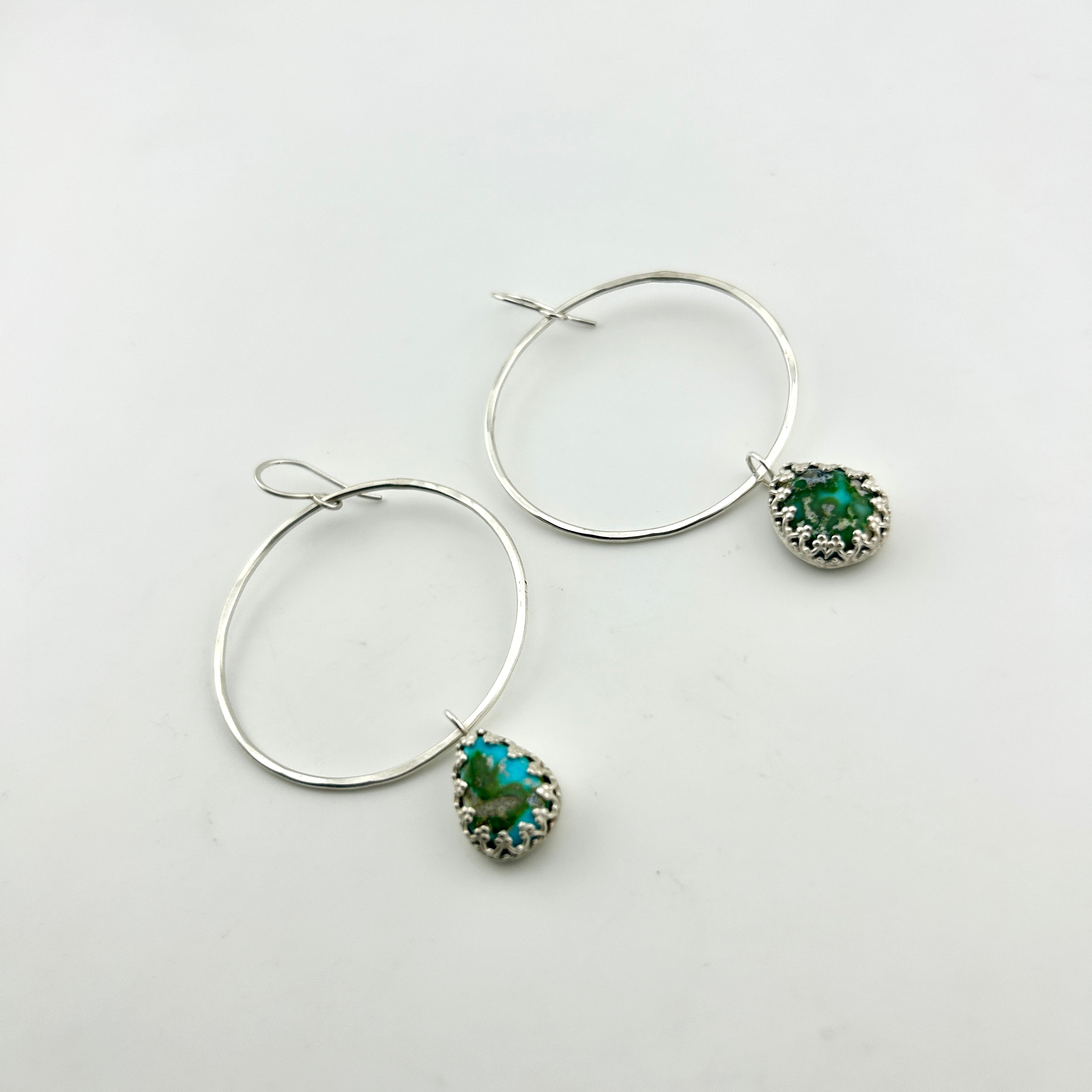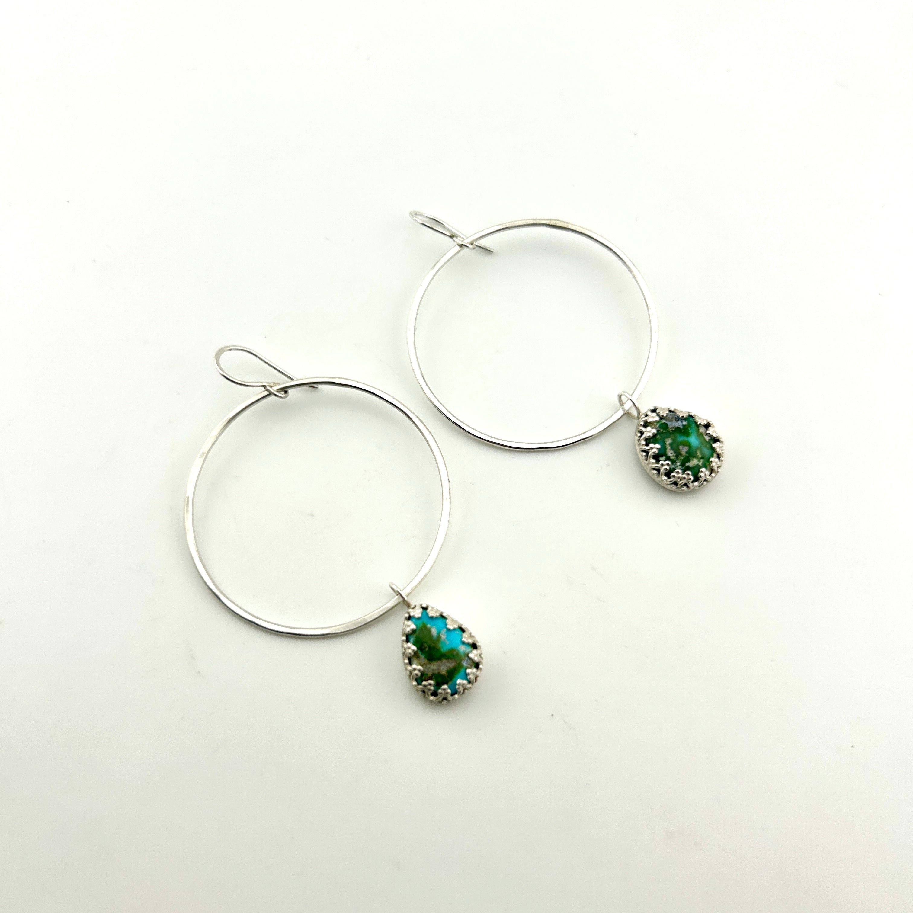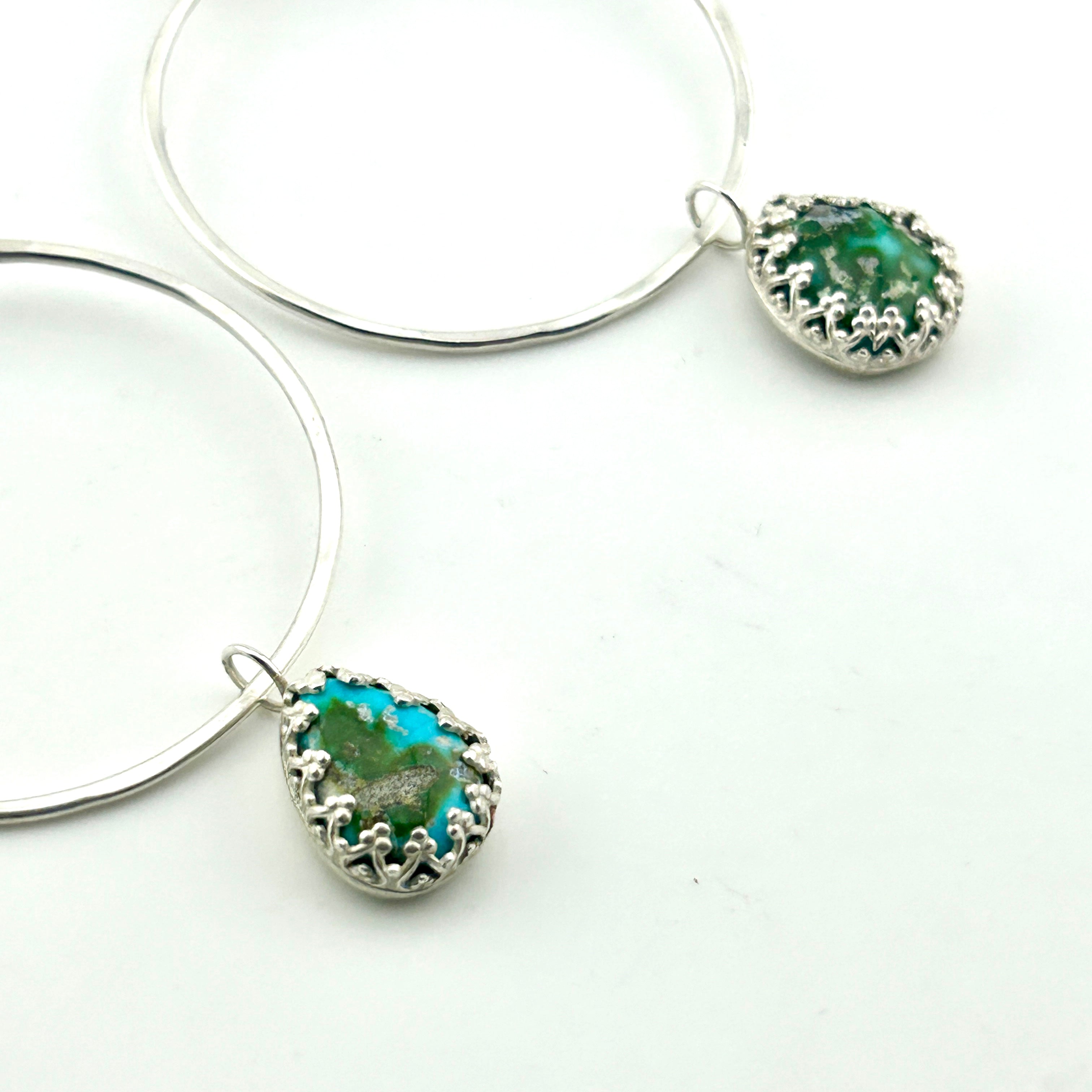 • Solid sterling silver hoops with stunning Sonoran Gold Turquoise accents