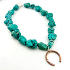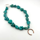 Meet the Neon Cowgirl — Desert Luck Necklace, a bold, playful take on desert spirit jewelry. Vibrant turquoise-dyed howlite stones bring a pop of neon sky blue, each one organically shaped and full of natural texture. At the center hangs a hand-forged copper horseshoe charm — intentionally facing downward to let luck and good energy flow straight to the wearer.