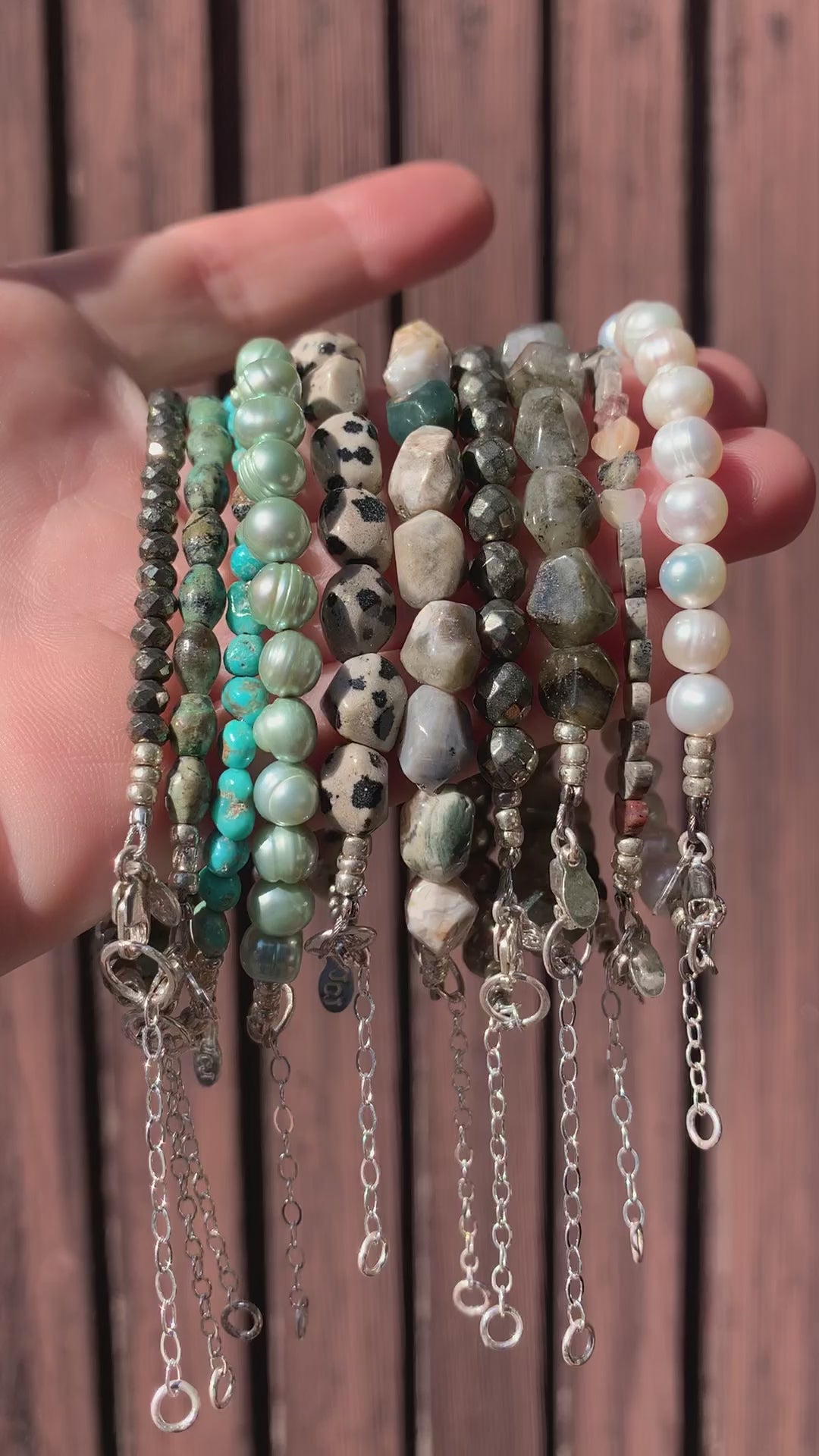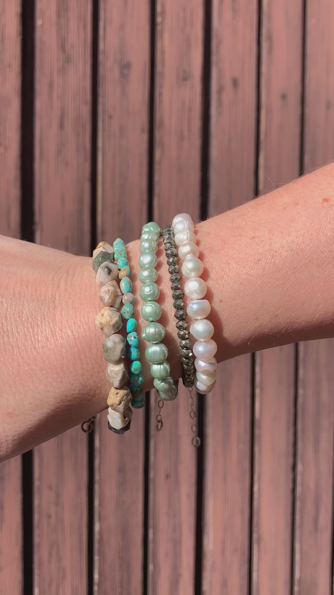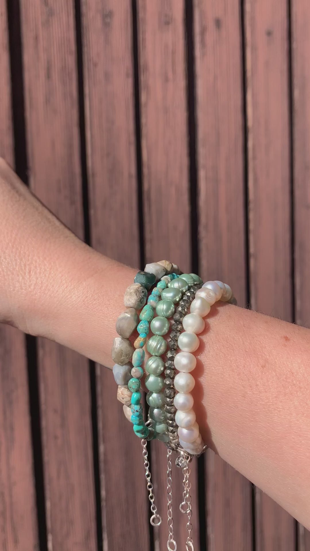 Hand strung sea foam blue green pearls create this is a one of a kind bracelet for the ocean lover! Bracelet is 6.5" with an 1 inch adjustable extender chain. If you need a different size, just let us know in a note in checkout.